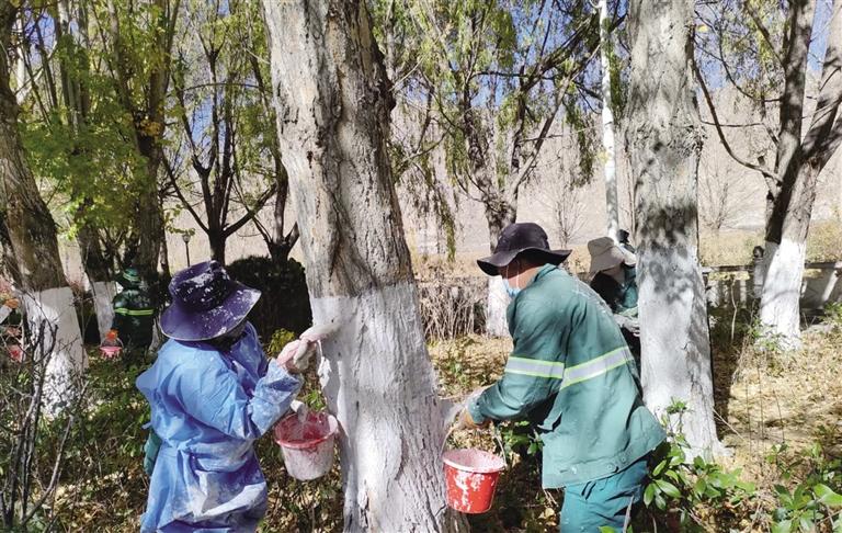 園林工人為樹木涂白防蛀蟲。 圖由拉薩城關區(qū)潔達園林綠化投資工程有限公司提供