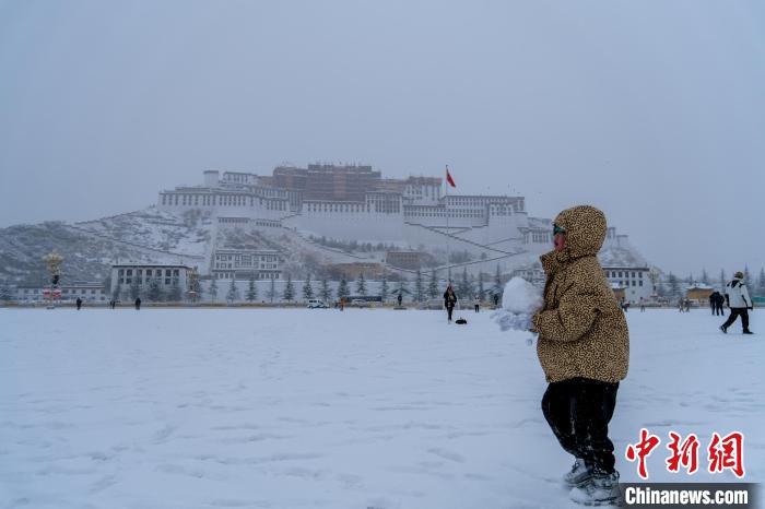 圖為1月18日,拉薩迎來2024年首場大雪,一位孩子在布達拉宮廣場玩雪。江飛波 攝