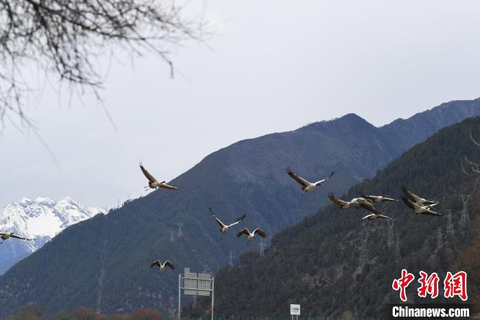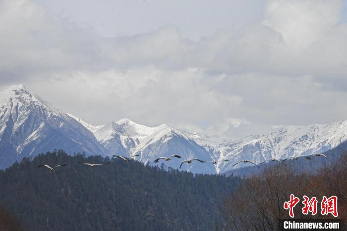 西藏林芝:黑頸鶴與雪山桃花共繪生態(tài)畫(huà)卷