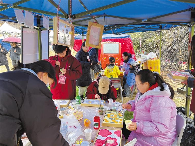 察隅縣桃花節(jié)的DIY活動(dòng)現(xiàn)場(chǎng),參與者將盛開(kāi)的桃花作為美術(shù)素材融入自己制作的肌理畫中。