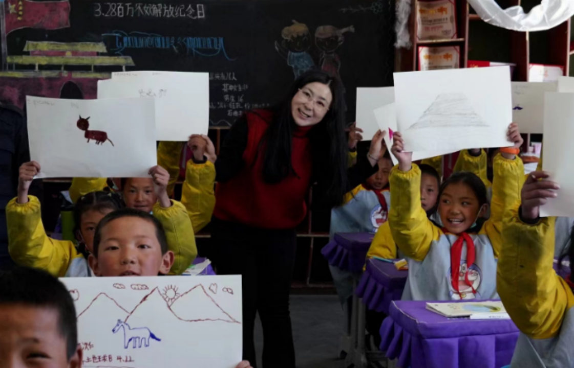 圖為“喜馬拉雅生靈的朋友”自然影像聯(lián)盟聯(lián)合創(chuàng)始人張麗娜為那曲市申扎縣第二完全小學學生講授自然教育知識。