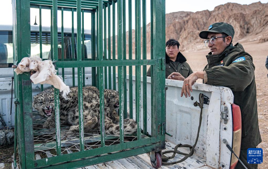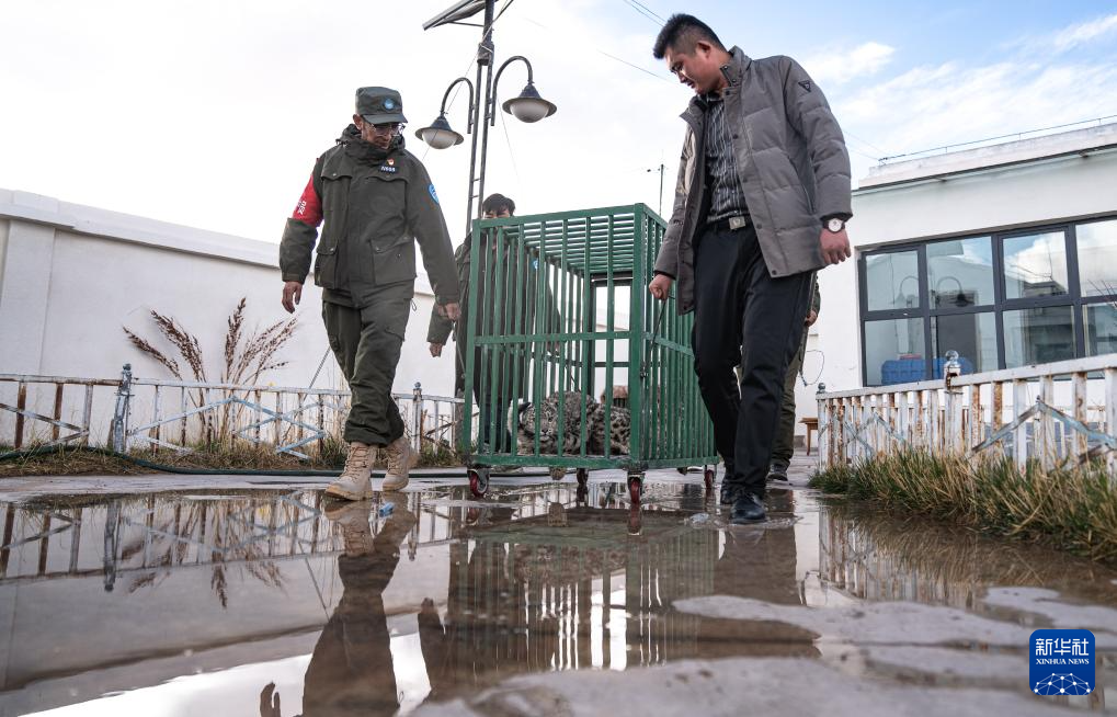 尼瑪縣野生動物管護(hù)隊員在運(yùn)送即將放歸自然的雪豹(5月13日攝)。新華社記者 丁增尼達(dá) 攝