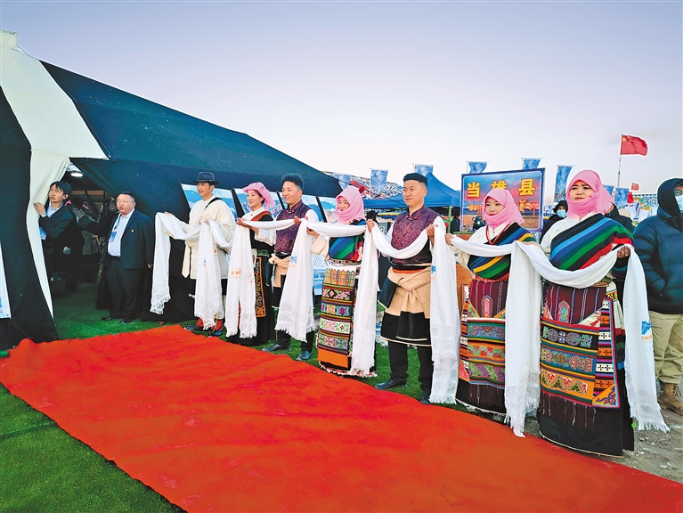 開湖意味著旅游旺季的到來。當(dāng)雄縣、尼木縣、曲水縣、城關(guān)區(qū)等縣區(qū)都搭起彩色帳篷,展示特色美食、文創(chuàng)產(chǎn)品和非遺文化。各縣區(qū)的文旅局長們集體“出攤”,向來賓做著熱情細(xì)致的宣介。林周縣的帳篷前,4位藏族農(nóng)牧民跳起舞蹈,這是從夯墻勞作中誕生的傳統(tǒng)舞蹈“阿嘎舞”;達(dá)孜區(qū)展出青稞精釀白啤酒、以黑頸鶴為靈感創(chuàng)作的文創(chuàng)產(chǎn)品、知名品牌的古檀香等特色商品;曲水縣在醒目位置放置著全域旅游手繪地圖、文旅產(chǎn)業(yè)招商引資項(xiàng)目介紹等手冊(cè)。