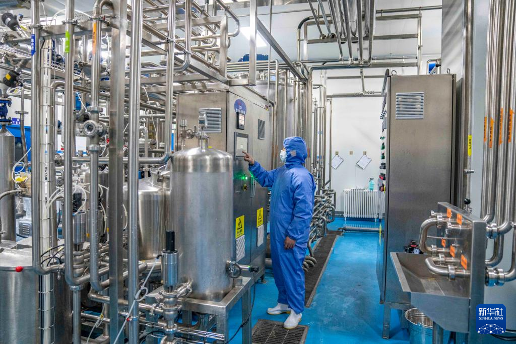 在聶榮縣嘎確生態(tài)畜牧業(yè)發(fā)展有限責任公司,工人在進行灌裝前的機械殺菌處理(5月13日攝)。新華社記者 孫非 攝