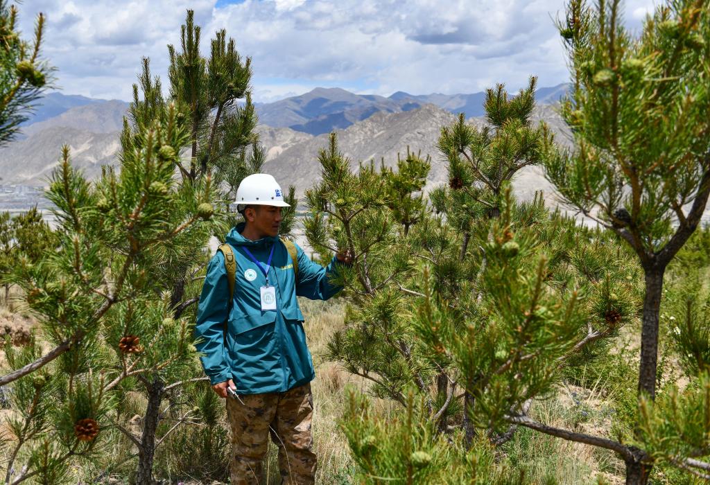 拉薩南北山綠化工程2024年度鞏固提升(貢嘎機(jī)場周邊山體)工程項目上,第三方監(jiān)理人員在檢查樹木狀況(6月3日攝)。新華社記者 晉美多吉 攝