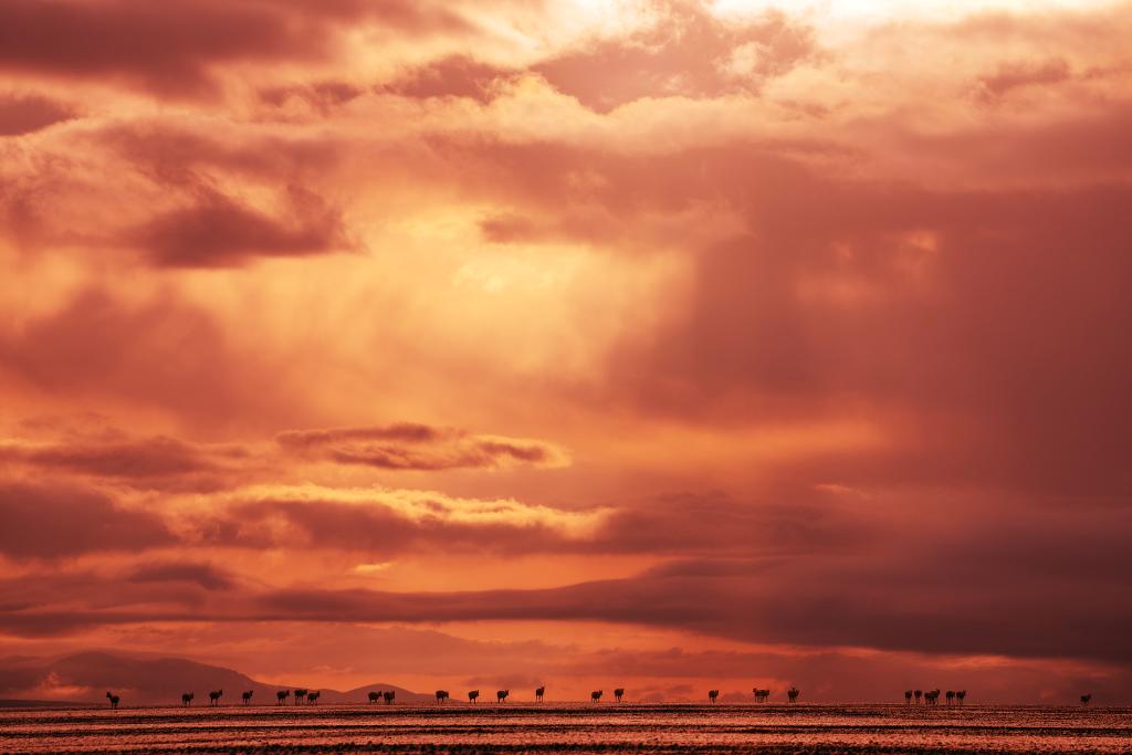 6月15日清晨雪后,在羌塘國家級自然保護區(qū),迎著朝霞前行在遷徙路上的一群藏羚羊。
