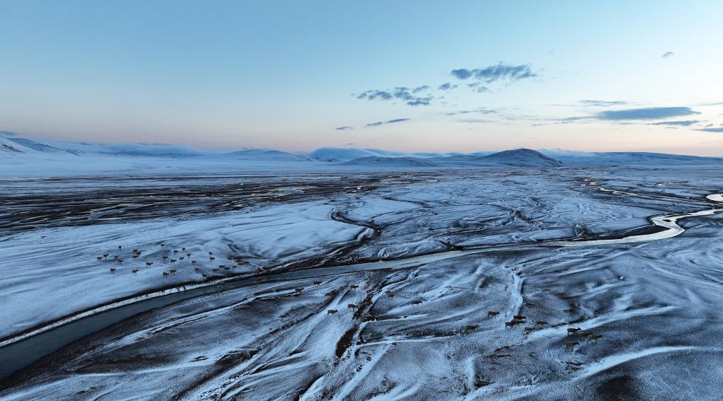 大群遷徙的藏羚羊途徑甜水河畔的荒灘雪地,向產(chǎn)羔地遷徙(6月15日攝)。