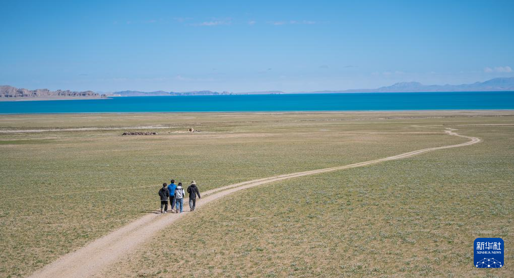 6月22日,游客漫步色林錯湖畔。新華社記者 丁增尼達 攝