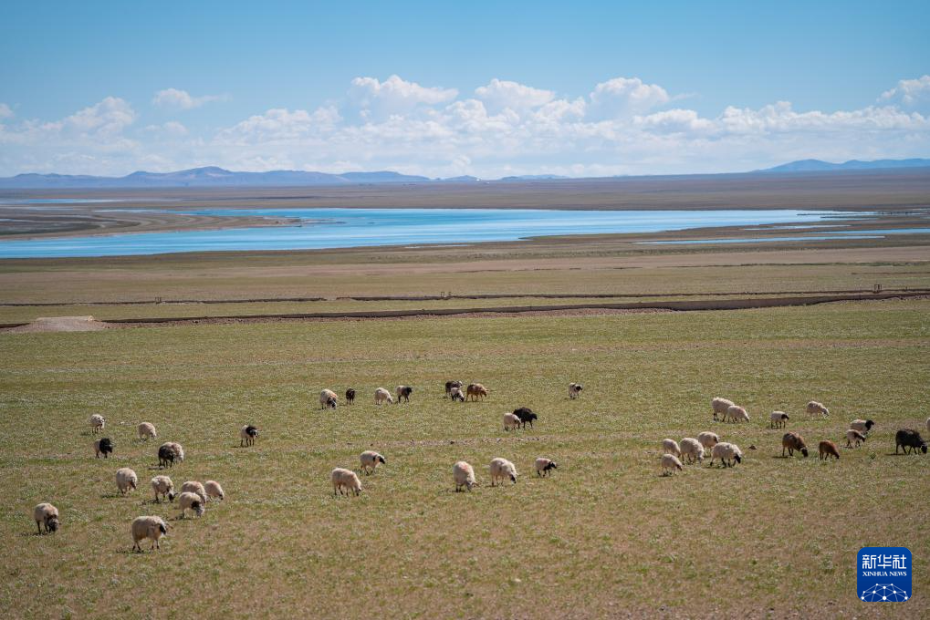 6月22日,羊群在色林錯湖畔草場上吃草。新華社記者 丁增尼達 攝