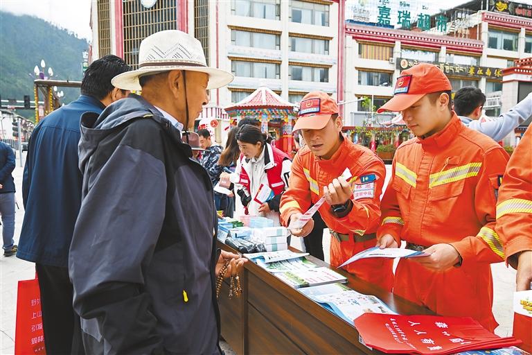 活動現(xiàn)場,波密縣森林消防中隊消防員通過發(fā)放防災(zāi)減災(zāi)宣傳資料、講解安全生產(chǎn)常識的形式,向過往群眾宣傳普及森林火災(zāi)、洪澇、山體滑坡、地震等自然災(zāi)害以及逃生自救、互救知識和技能。
