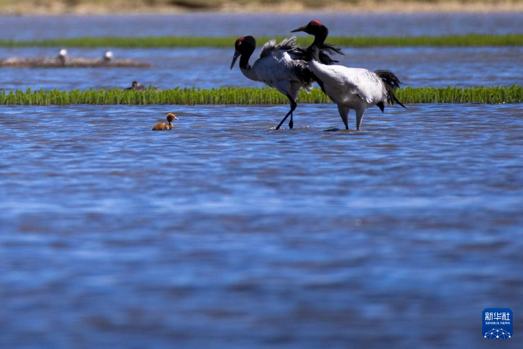 這是在那曲市申扎縣拍攝的養(yǎng)育雛鳥(niǎo)的黑頸鶴(6月9日攝)。新華社記者 姜帆 攝