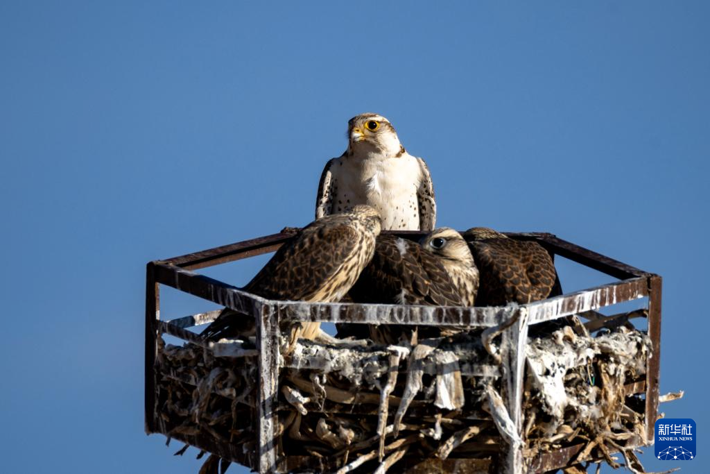 這是在那曲市尼瑪縣拍攝的養(yǎng)育雛鳥(niǎo)的游隼,它們?cè)凇盁o(wú)人區(qū)”中林草部門(mén)樹(shù)立的“鷹架”上營(yíng)巢(6月13日攝)。新華社記者 姜帆 攝