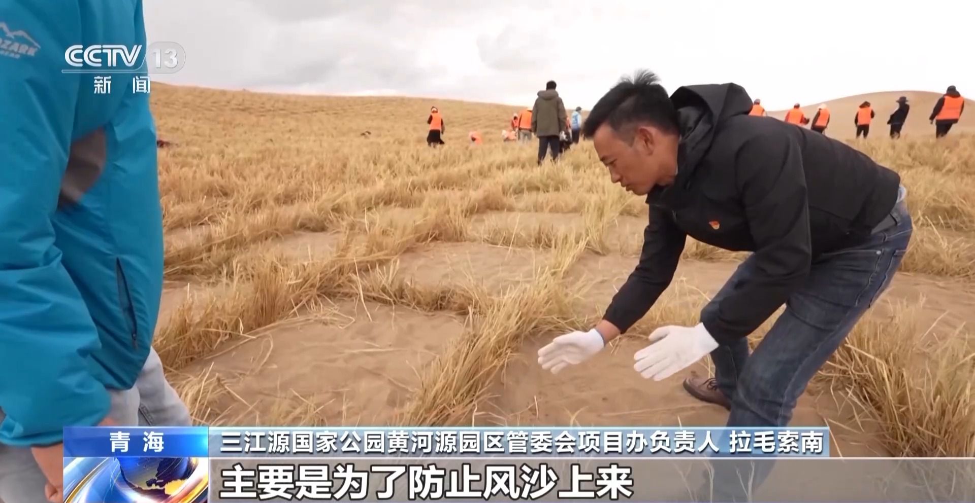 三江源國家公園黃河源園區(qū)管委會項目辦負責人 拉毛索南:草方格整體打好以后,把草籽灑在這些中間里面,它就主要是為了防止風沙上來,把草籽埋得更深。