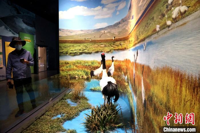 7月24日,參加“中國式現(xiàn)代化的萬千氣象·網(wǎng)絡(luò)名人青海行”活動的網(wǎng)絡(luò)名人,抵達(dá)江河源頭青海玉樹藏族自治州,在玉樹州博物館一覽自然與人文之美。玉樹州博物館是玉樹地震災(zāi)后重建十大標(biāo)志性建筑之一,分為序廳、自然展區(qū)、人文展區(qū)、臨時(shí)展廳。其通過實(shí)物標(biāo)本等方式,展示了三江源和可可西里的野生動物、草地、森林,以及玉樹州的歷史、建筑、服飾、飲食等。圖為玉樹州博物館展示的黑頸鶴棲息環(huán)境。中新社記者 張?zhí)砀?攝