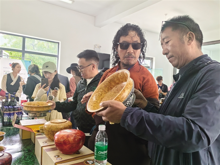 探訪團一行前往西藏山南加查達布傳統(tǒng)文化產(chǎn)業(yè)發(fā)展有限公司探訪加查木碗的制作技藝。在該公司的展廳內(nèi),西藏自治區(qū)級加查木碗非遺傳承人、公司負(fù)責(zé)人桑珠向探訪團詳細(xì)講解了加查木碗從選材、切割、打磨到雕刻的每一個制作環(huán)節(jié)。桑珠拿起一個個造型各異、原材料不同的木碗向探訪團介紹著木碗的品質(zhì)分辨技巧、用處等。楊樹、松樹、柏樹……一塊塊承載著歲月的木頭,經(jīng)過木匠們的一道道復(fù)雜的工序后,變成了精美的藝術(shù)品?!斑@種碗面像圓珠筆點涂的是上等木料制成的精品,最低售賣價值可達到4000元一個。”桑珠說,“現(xiàn)在來買木碗的人越來越多,很多游客也會買回去當(dāng)伴手禮。這讓我更加堅定了傳承和發(fā)展這項技藝的決心。”