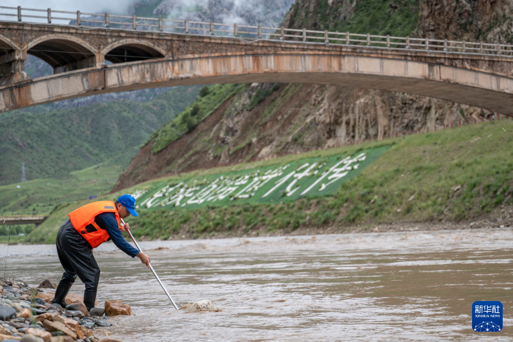 7月21日,在囊謙香達(dá)河段,科考隊員在進行底棲生物監(jiān)測采樣。新華社記者 伍志尊 攝