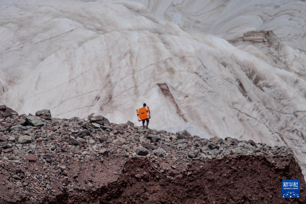 7月25日,在冬克瑪?shù)妆ǎ瓶缄爢T在探測冰川(無人機照片)。新華社記者 伍志尊 攝