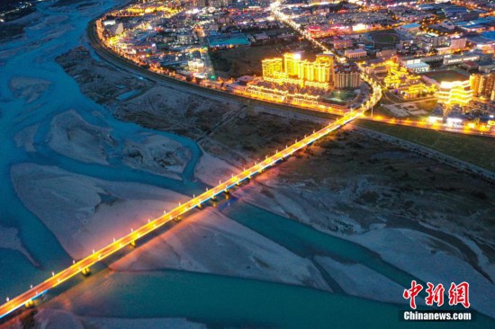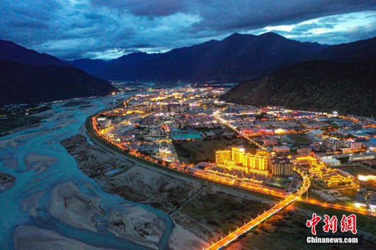8月22日晚,西藏林芝市城市夜景美,城市建筑、橋體的燈光與尼洋河相映成趣,景色美麗。(無人機照片)中新社記者 貢嘎來松 攝