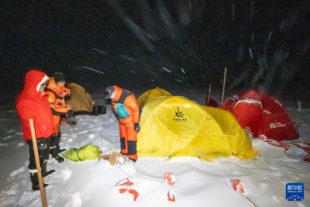 科考隊員在夜間的大風(fēng)雪中加固營地(9月11日攝)。新華社記者 姜帆 攝