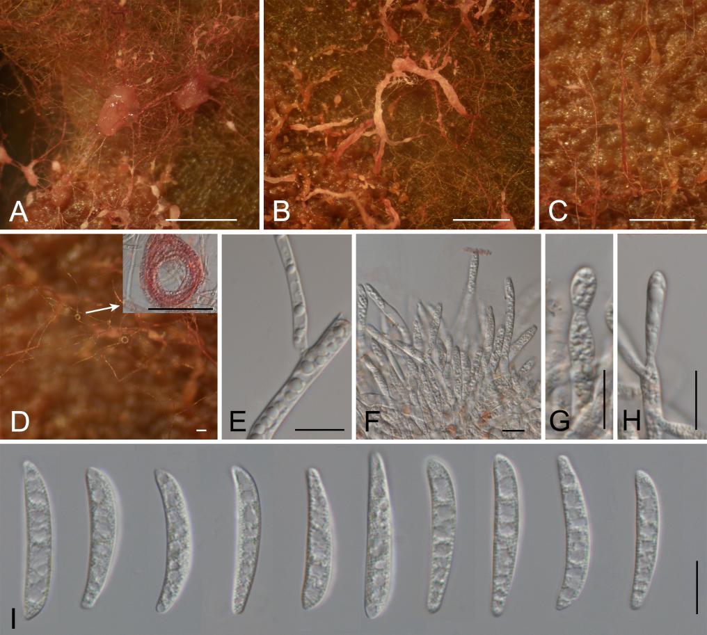 西藏梭孢菌的形態(tài)。A、B:PDA上形成的分生孢子團(tuán),C:紅色的菌絲,D:菌絲結(jié)環(huán),E:透明的菌絲,F(xiàn)-H:產(chǎn)孢細(xì)胞及初生的分生孢子,I:分生孢子。標(biāo)尺A-C=500μm;D=50μm;E-I=10μm。(西藏自治區(qū)生態(tài)環(huán)境廳供圖)
