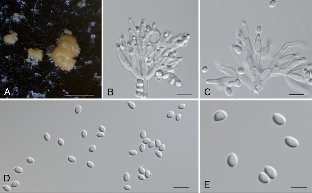 西藏螺旋聚孢霉的形態(tài)。A:PDA上形成的分生孢子團(tuán),B、C:產(chǎn)孢細(xì)胞及初生的分生孢子,D、E:分生孢子。標(biāo)尺A=300μm;B-E=10μm。(西藏自治區(qū)生態(tài)環(huán)境廳供圖)