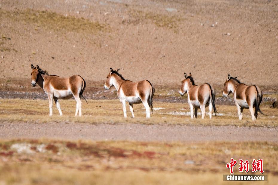 西藏羌塘草原位于昆侖山脈、唐古拉山脈和岡底斯山脈之間,是野生動(dòng)植物的天堂。近日,中新社記者探訪(fǎng)西藏羌塘草原腹地那曲市雙湖縣,看到當(dāng)?shù)夭亓缪颉⒉匾绑H、藏原羚等野生動(dòng)物成群覓食,悠然自得。圖為10月3日,羌塘草原上的一群藏野驢悠閑覓食。