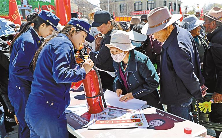 消防宣傳員在扎西曲登社區(qū)開(kāi)展消防宣傳活動(dòng)。