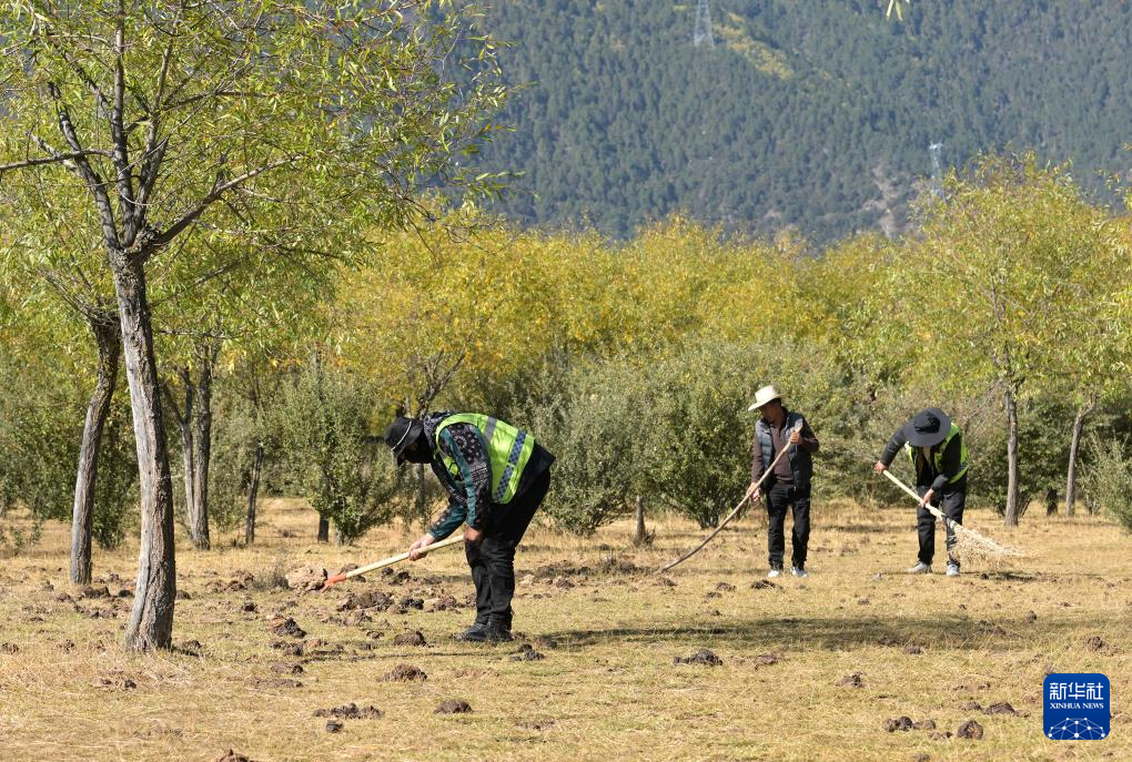在西藏林芝雅尼國(guó)家濕地公園內(nèi),濕地管護(hù)隊(duì)員們進(jìn)行每日的例行清理維護(hù)(10月24日攝)。新華社記者 李賀 攝
