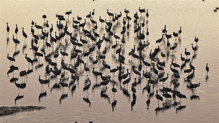 黑頸鶴是全球15種鶴類中唯一在高原地區(qū)生活、繁殖的鶴類,屬國家一級保護動物。每年10月中下旬,大批黑頸鶴從藏北高原飛到拉薩河谷,它們在農(nóng)田、沼澤地里覓食嬉戲,享受冬日暖陽。