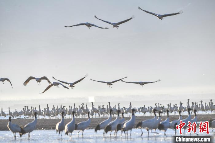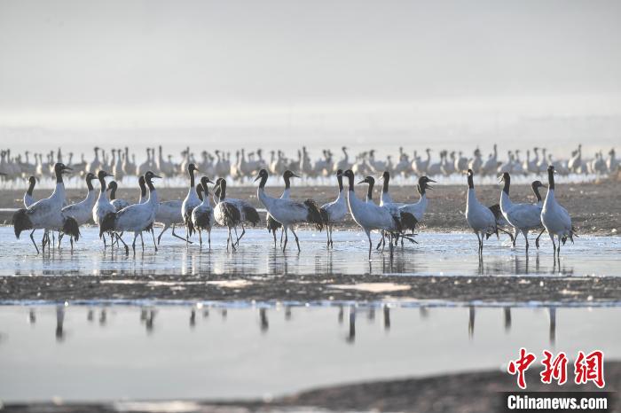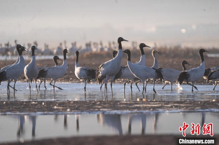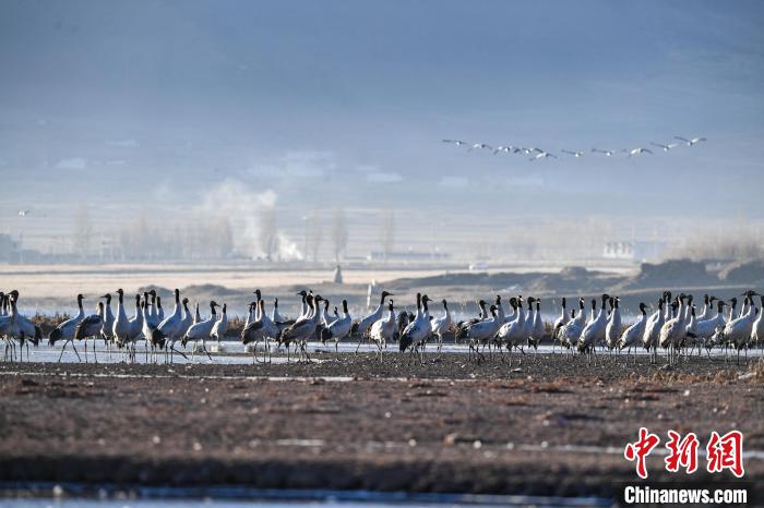 11月27日晨,西藏自治區(qū)拉薩市林周縣黑頸鶴保護區(qū)內(nèi),大量越冬的黑頸鶴在虎頭山水庫覓食、嬉戲。林周縣位于拉薩河上游及澎波河流域,平均海拔約4200米,是黑頸鶴的主要越冬地之一。中新社記者 貢嘎來松 攝