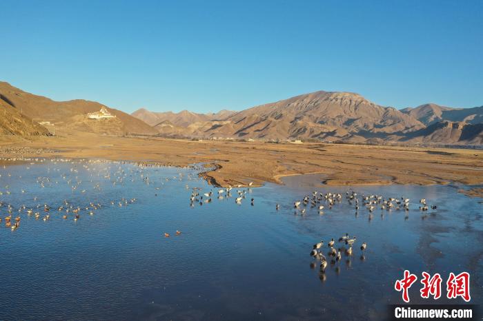 11月27日晨,西藏自治區(qū)拉薩市林周縣黑頸鶴保護區(qū)內(nèi),大量越冬的黑頸鶴在虎頭山水庫覓食、嬉戲。林周縣位于拉薩河上游及澎波河流域,平均海拔約4200米,是黑頸鶴的主要越冬地之一。(無人機照片)中新社記者 貢嘎來松 攝