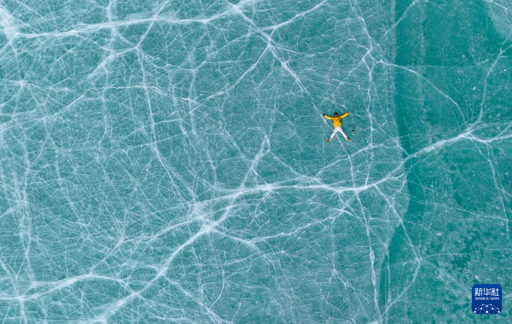 12月7日,一名游客躺在瓊穆崗嘎峰前的冰湖上拍照(無人機(jī)照片)。新華社記者 丁增尼達(dá) 攝