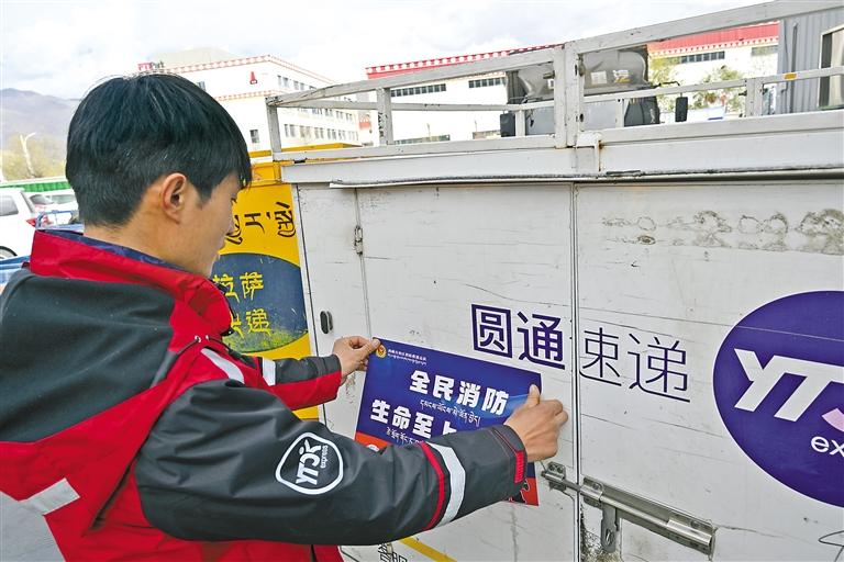 志愿者在快遞車上張貼消防宣傳海報(bào)。 郎永庫 李鑫舞 攝