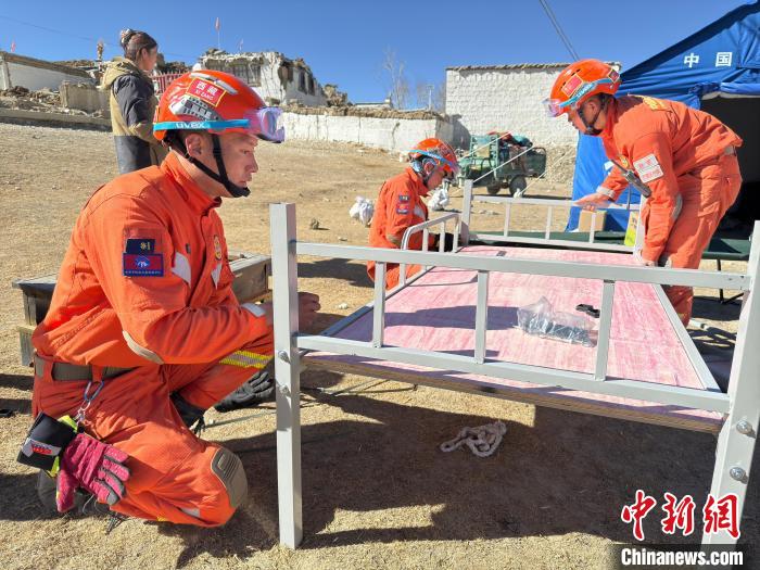 圖為消防指戰(zhàn)員正在為災(zāi)區(qū)組裝床鋪。西繞拉翁 攝