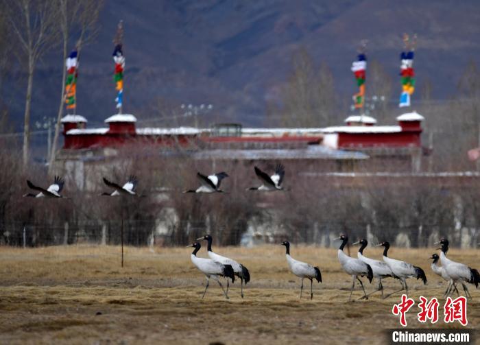 黑頸鶴是全球十五種鶴類(lèi)中唯一在高原地區(qū)繁殖和越冬的鶴類(lèi),被譽(yù)為“高原神鳥(niǎo)”,屬中國(guó)國(guó)家一級(jí)保護(hù)動(dòng)物。每年10月中下旬左右,黑頸鶴陸續(xù)飛抵雅魯藏布江中游河谷等地越冬。圖為3月8日,棲息在西藏拉薩林周縣的黑頸鶴。中新社記者 李林 攝