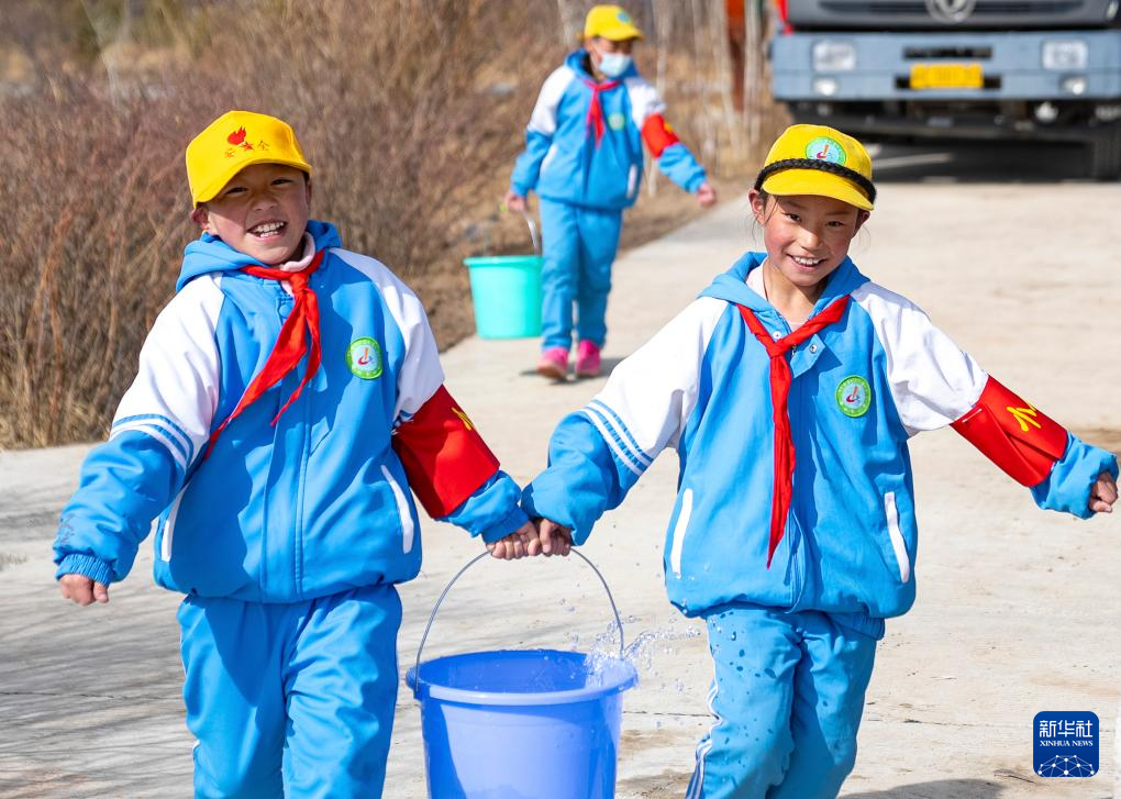 4月25日,幾名那曲市小學(xué)四年級(jí)學(xué)生在搬水準(zhǔn)備給樹苗澆水。新華社記者 丁增尼達(dá) 攝