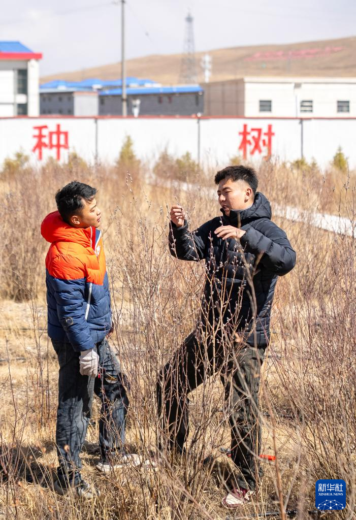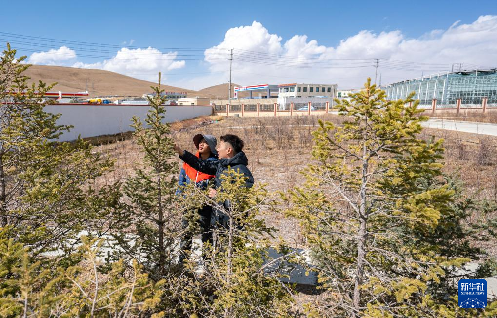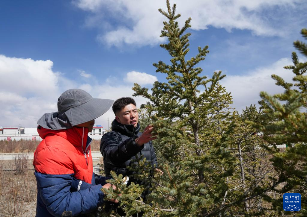 4月25日,那曲市林業(yè)和草原局工作人員在檢查樹木長勢。新華社記者 丁增尼達(dá) 攝
