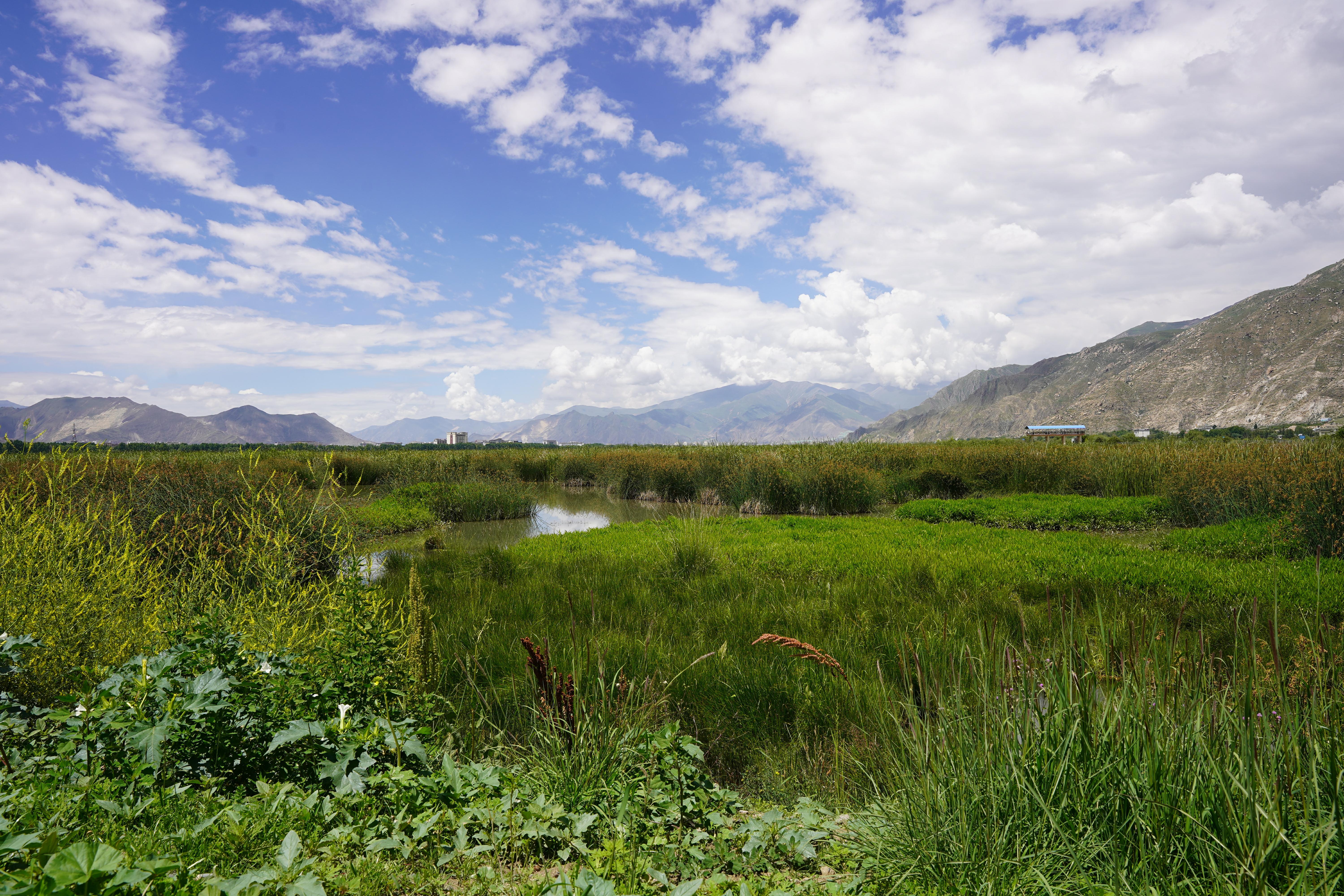 五月的拉薩,雨水濕潤了整個(gè)大地。早晨的陽光透過層層云霧,灑在郁郁蔥蔥的拉魯濕地上。她仿佛一位佳人,身披翠綠的薄紗,靜靜地佇立在那里,等待著人們與她在初夏撞個(gè)滿懷。