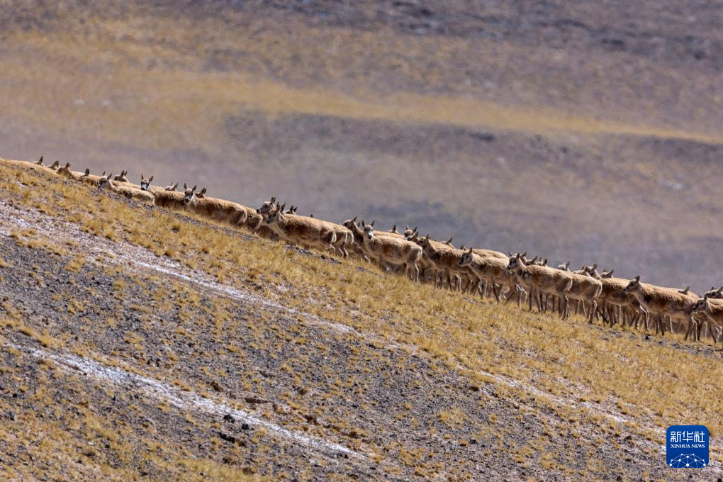 在羌塘國家級自然保護區(qū)核心區(qū)拍攝的遷徙中的雌藏羚羊群(6月9日攝)。新華社記者 旦增尼瑪曲珠 攝