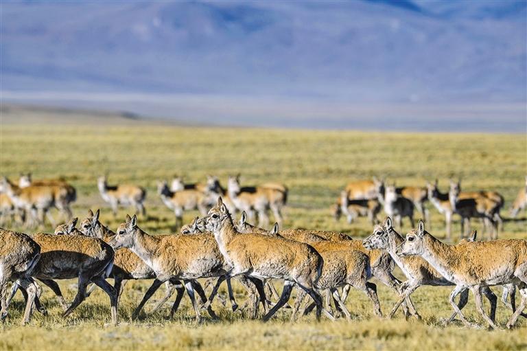 每年5月至7月,藏北高原羌塘國(guó)家級(jí)自然保護(hù)區(qū)內(nèi)的雌性藏羚羊進(jìn)入遷徙繁殖季。它們從平時(shí)散居的棲息地匯集一處,形成成千上萬(wàn)頭的種群,遵循同樣的時(shí)間和路線,向著族群自古以來(lái)的產(chǎn)羔地遷徙,這是被譽(yù)為“全球最壯觀的三大有蹄類(lèi)動(dòng)物大遷徙之一”的藏羚羊遷徙。