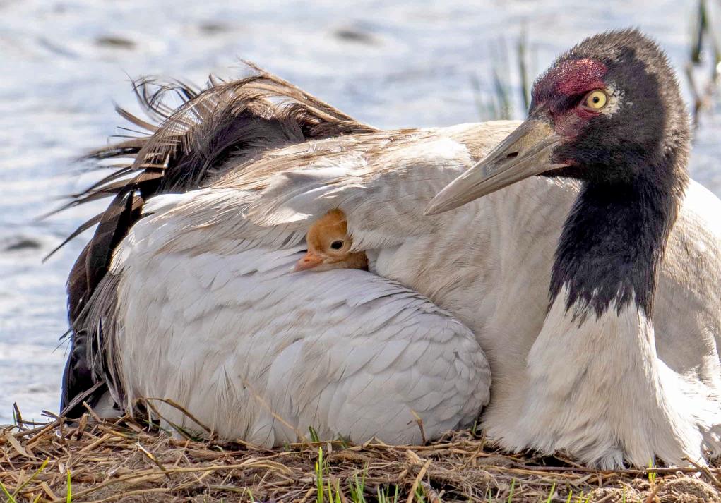 一只黑頸鶴在西藏那曲市申扎縣的申扎藏布濕地上照顧剛出殼的雛鳥(6月5日攝)。 新華社記者 姜帆 攝