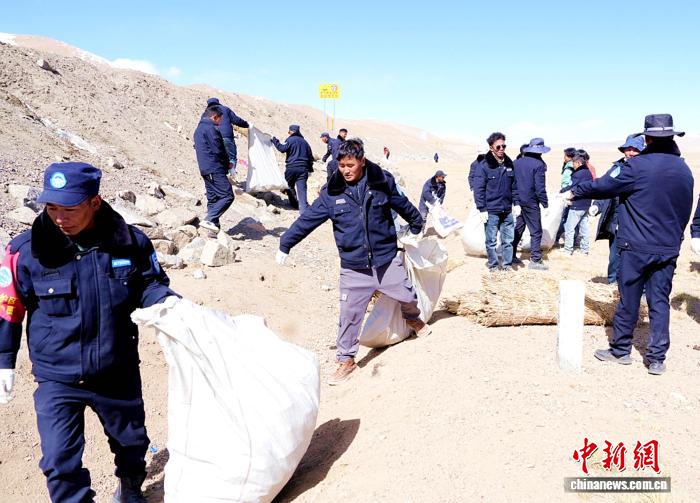 圖為參加專項清潔行動的專業(yè)管護(hù)人員撿拾G216國道兩側(cè)垃圾。索朗仁青 供圖