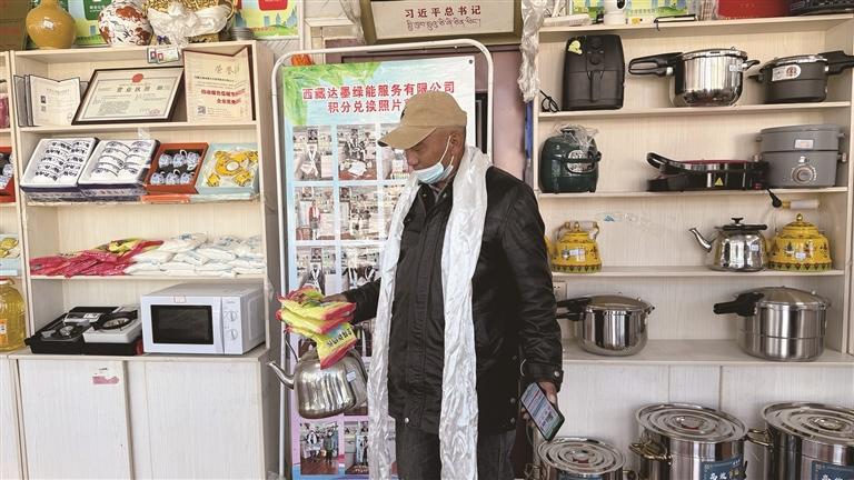當(dāng)時(shí),該超市還有其他群眾在兌換物品?!袄旁谶@里變成了值錢的東西,真正實(shí)現(xiàn)了變廢為寶!”德慶鎮(zhèn)村民旺姆捧著手機(jī),滿臉笑意地向記者展示積分頁面里面她的5386積分,她正盤算著兌換5套規(guī)格不同的鋁鍋和一套甜茶餐具。“之前用積分換過大米、洗衣液、洗潔精、油等物品,這次想換些實(shí)用的大件。”旺姆說,最讓她滿意的是兌換的奶粉,“省下了制作甜茶時(shí),買奶粉的錢,這積分兌換真是辦到了我們心坎里?!?/p>
