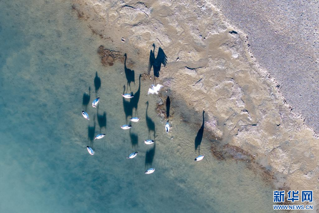 12月19日,在西藏日喀則市南木林縣的雅魯藏布江河畔拍攝的黑頸鶴(無人機照片)。新華網(wǎng) 旦增努布 攝