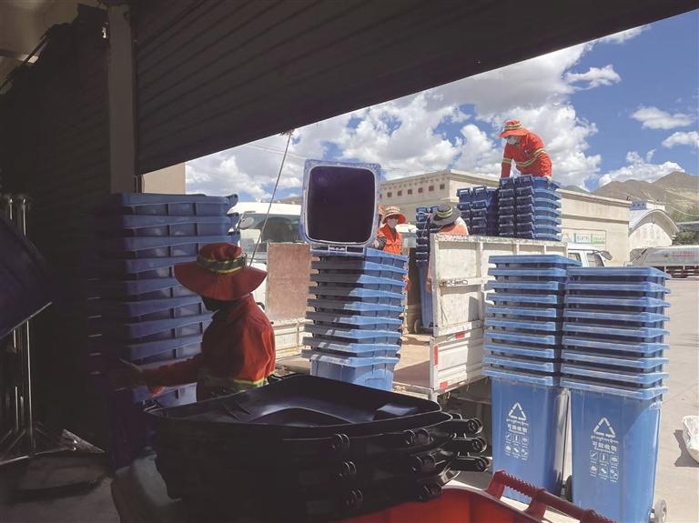 城關(guān)區(qū)環(huán)衛(wèi)局垃圾分類辦給社區(qū)發(fā)放垃圾分類設(shè)備。文/圖 記者 芮怡星