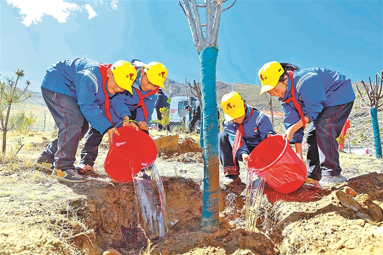 墨竹工卡縣自然資源和林業(yè)草原局干部職工、縣南京實(shí)驗(yàn)小學(xué)師生代表等參加義務(wù)植樹活動。這是小學(xué)生在為綠植澆水。記者 格桑倫珠 攝