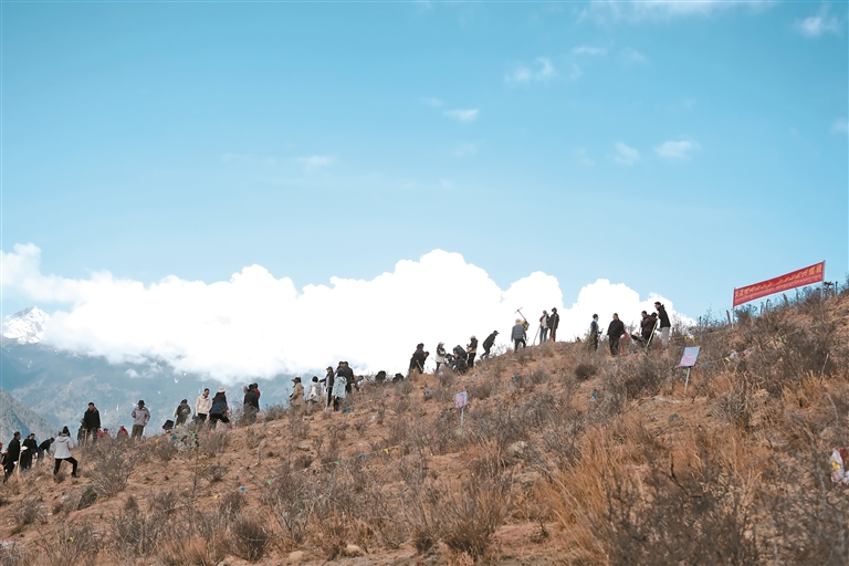 林芝市巴宜區(qū)區(qū)直各部門干部職工、消防指戰(zhàn)員及群眾在林芝鎮(zhèn)嘎拉村生態(tài)修復(fù)項(xiàng)目區(qū)的山坡上,遍植1100余株光核桃樹、杏梅樹。記者 謝筱純 攝