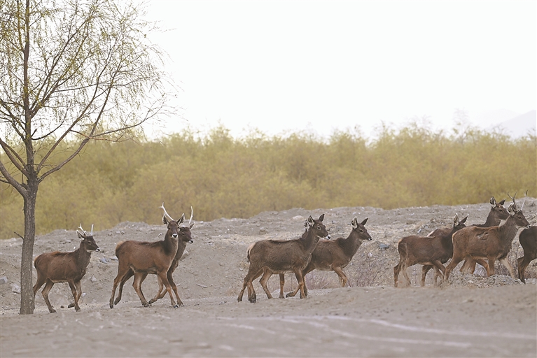 圖為白唇鹿現(xiàn)身江畔草地。記者 洛桑平措 攝