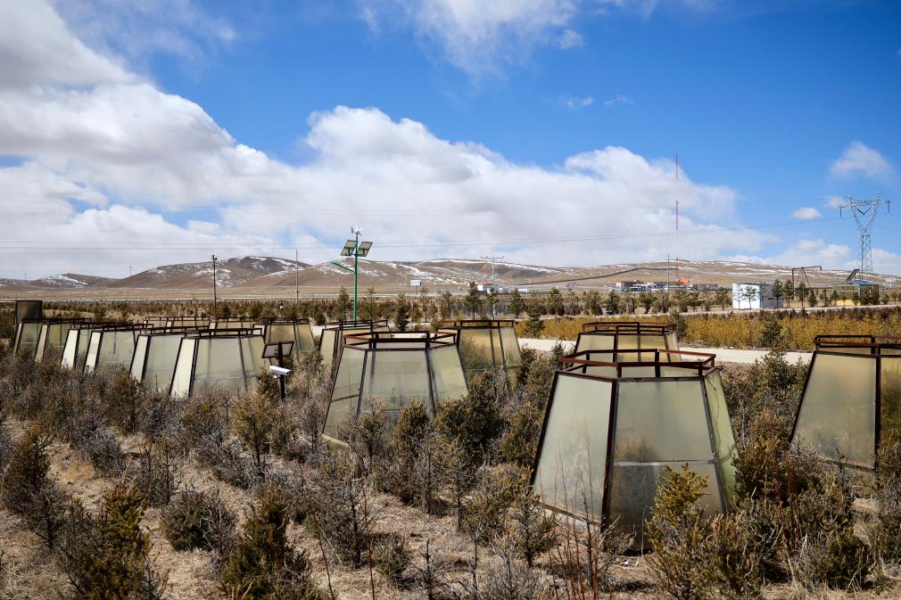 西藏那曲地區(qū)城鎮(zhèn)植樹關(guān)鍵技術(shù)研發(fā)與綠化模式示范項(xiàng)目示范基地中的頂開式濾光溫室。新華社記者 周昱龍 攝