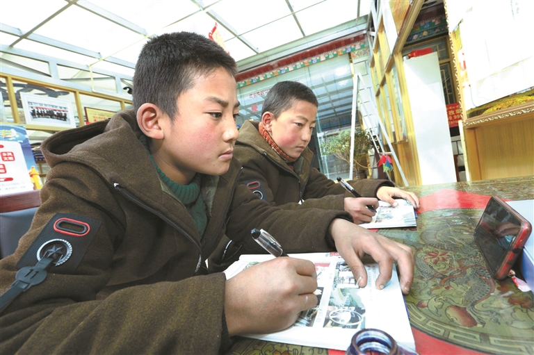 為在西藏拉薩市墨竹工卡縣甲瑪鄉(xiāng)孜孜榮村兩名中學(xué)生通過(guò)釘釘軟件上網(wǎng)課。由墨竹工卡縣委宣傳部洛克攝